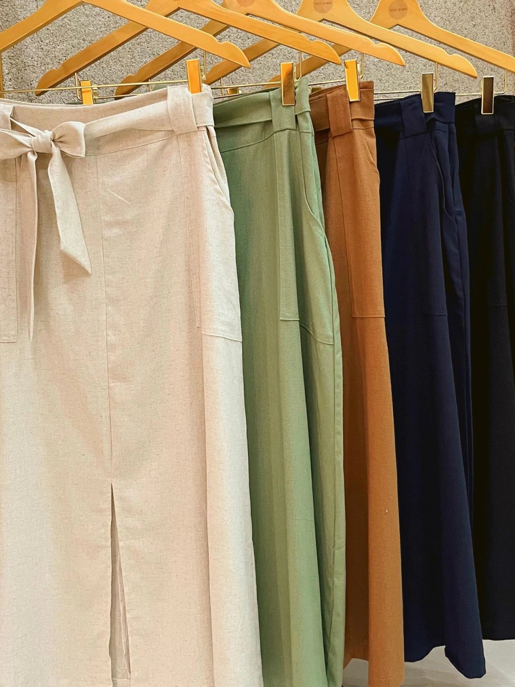 Essa saia apresenta um comprimento Midi, fenda frontal, que trás modernidade e movimento ao look, bolsos funcionais e o detalhe de amarração na cintura que dá um charme especial ✨